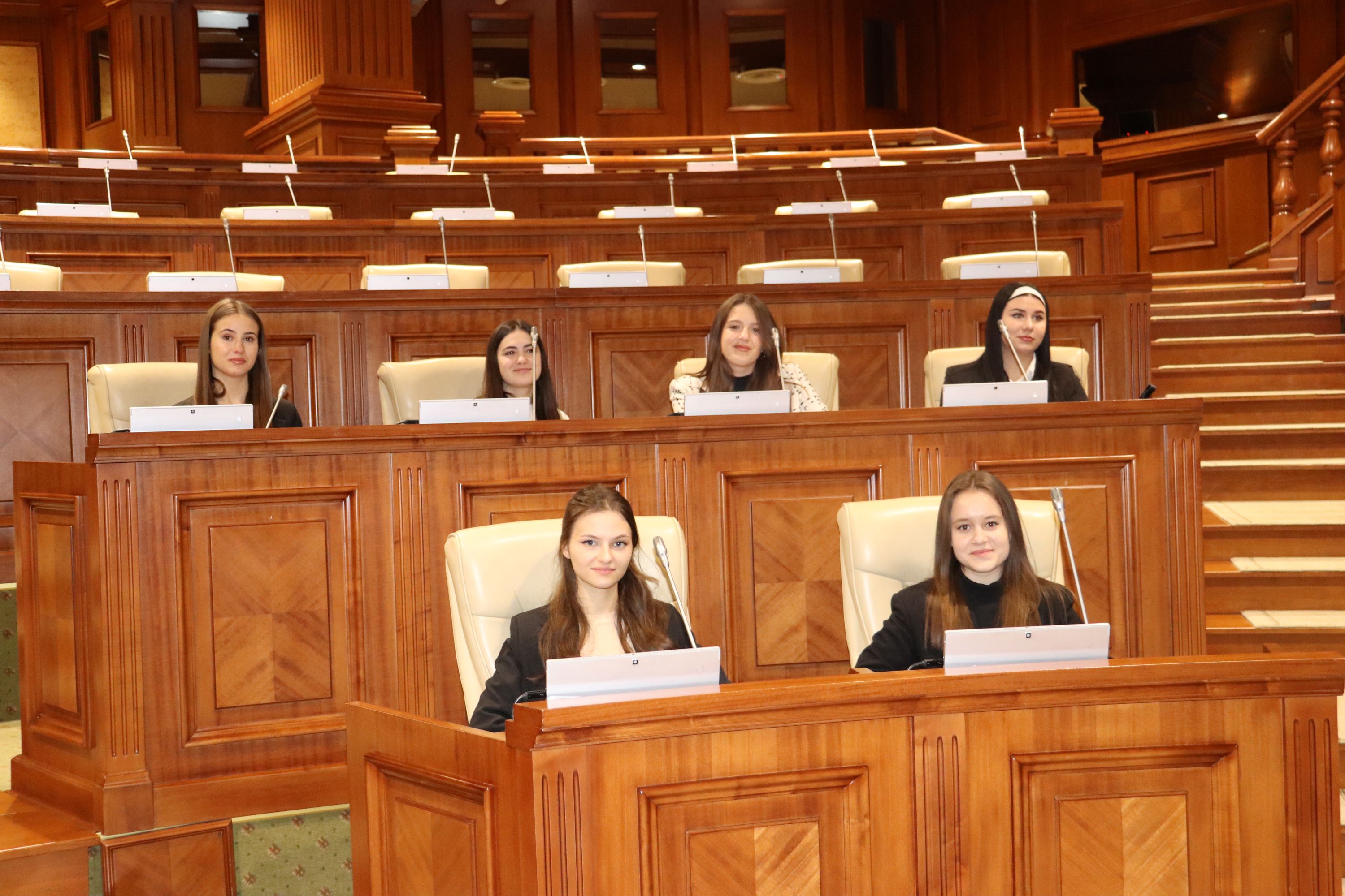Vizita de studiu a început la Parlamentul RM, fetele lidere au avut parte de o excursie la Muzeul Parlamentului, unde au putut vedea exponate, documente, cărți, fotografii, suvenire și cadouri protocolare. Următoarea destinație a fost Sala de plen a Legislativului, acesta fiind și cea mai interesantă pentru fete. În Sala de plen a Legislativului echipa a avut ocazia să discute cu deputatul Ion Babici despre importanța participării femeilor în politică.
